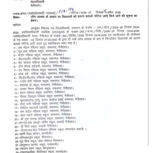 नैनीताल: 34 स्कूलों को कारण बताओ नोटिस, रामनगर, भवाली, भीमताल और लालकुआ के विद्यालयों से मांगा गया स्पष्टीकरण
