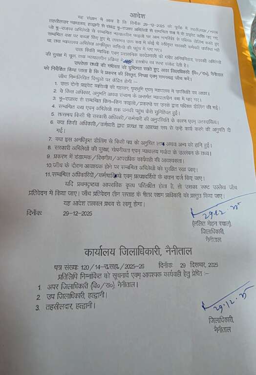 हल्द्वानी। तहसीलदार/नायब तहसीलदार न्यायालय, हल्द्वानी से जुड़ा एक गंभीर मामला सामने आया है। दिनांक 29 दिसंबर 2025 को पूर्वाह्न के समय तहसील परिसर स्थित भू-राजस्व अभिलेखों से संबंधित न्यायालयीन कक्ष में दो प्राइवेट व्यक्ति पाए गए, जो आम नागरिकों से पब्लिक डीलिंग करते हुए न्यायालयीन फाइलों पर काम कर रहे थे। चौंकाने वाली बात यह रही कि उस समय संबंधित कक्ष में कोई भी अधिकृत सरकारी कर्मचारी मौजूद नहीं था और महत्वपूर्ण न्यायालयीन अभिलेख अनधिकृत व्यक्तियों की पहुंच में थे। प्रशासन के संज्ञान में आने के बाद इस पूरे मामले को न्यायिक एवं प्रशासनिक व्यवस्था की गंभीर अनियमितता, सरकारी अभिलेखों की सुरक्षा में बड़ी चूक तथा न्यायालयीन प्रक्रिया में बाहरी हस्तक्षेप माना गया है।