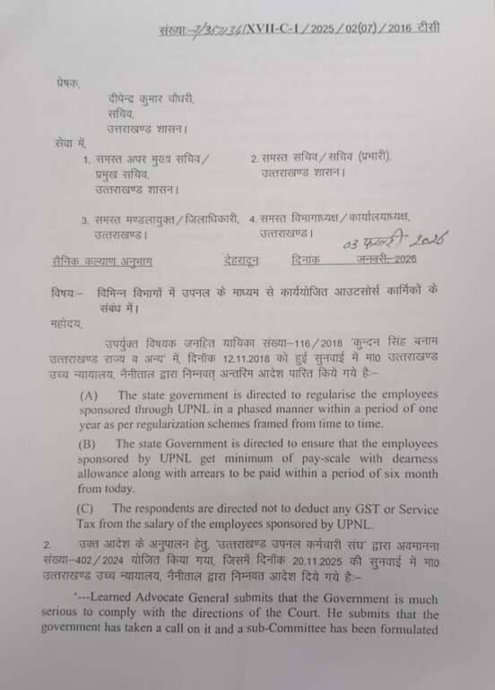 ‘समान कार्य, समान वेतन’ के रूप में सीएम धामी ने दर्ज की एक और उपलब्धि उपनल कर्मियों की वर्षों पुरानी लंबित मांग को सीएम धामी ने पूरा किया उपनल कर्मियों को दस वर्ष की सेवा पूरी करने पर समान कार्य के बदले समान वेतन दिए जाने का शासनादेश जारी होने के साथ ही, मुख्यमंत्री पुष्कर सिंह धामी के खाते में एक और बड़ी उपलब्धि दर्ज हो गई है।उपनल कर्मी अपनी विभिन्न मांगों के लिए लंबे समय से आंदोलनरत थे, इस बीच कई सरकारें बदली। आखिरकार अब मुख्यमंत्री पुष्कर सिंह धामी की पहल पर उपनल कर्मियों को दस साल की सेवा पूरी करने पर समान कार्य के बदले समान वेतन मिलने का शासनादेश जारी हो गया है। यह उपलल कर्मियों के लिए बेहद महत्वपूर्ण है। इस तरह मुख्यमंत्री पुष्कर सिंह धामी ने राज्य के हजारों लोगों के भविष्य से जुड़े एक और जटिल विषय का समाधान कर दिया है। जिससे ना सिर्फ विभागों की कार्य दक्षता में सुधार होने की उम्मीद है, बल्कि उपनल कर्मचारियों का भविष्य भी सुरक्षित हो गया है। इससे पहले मुख्यमंत्री पुष्कर सिंह धामी समान नागरिक संहिता, सख्त नकल विरोधी कानून, भू कानून, धर्मांतरण विरोधी कानून जैसे वर्षों पुरानी लंबित मांगों पर ठोस कानूनी कार्रवाई कर चुके हैं। उपनलकर्मियों को समान कार्य के बदले समान वेतन प्रदान कर दिया गया है। सरकार कार्मिक हितों के लिए पहले दिन से ही प्रतिबद्ध है। हम प्रदेश हित में हर जटिल मुद्दे का समाधान निकालने के लिए अतिरिक्त प्रयास करने के लिए तैयार हैं। पुष्कर सिंह धामी, मुख्यमंत्री उत्तराखंड—