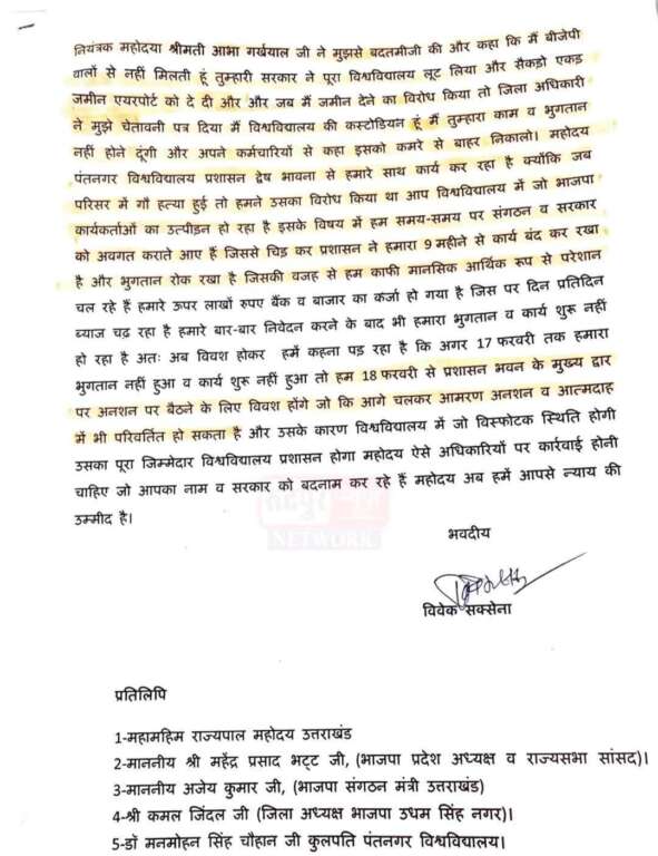 पंतनगर विश्वविद्यालय में निर्माण कार्य को लेकर ठेकेदार एवं भाजपा नि. जिलाध्यक्ष विवेक सक्सेना ने दी आत्मदाह की चेतावनी, लिखा CM धामी को पत्र