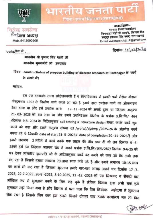 पंतनगर विश्वविद्यालय में भवन निर्माण कार्य को लेकर मुख्यमंत्री पुष्कर धामी को भाजपा के निवर्तमान जिला अध्यक्ष विवेक सक्सेना ने पत्र लिखते हुए अपनी पीड़ा रखी है, जिसमें विवेक सक्सेना ने कहा है कि हम एक उत्तराखंड राज्य आंदोलनकारी हैं व विश्वविद्यालय में हमारी फर्म मैसेज श्रीराम कंस्ट्रक्शन 1992 से निर्माण कार्य करते आ रही है हमारे द्वारा उपरोक्त कार्य का ऑनलाइन टेंडर डाला था और हमें उपरोक्त कार्य 12-12-2024 को अवार्ड हुआ था