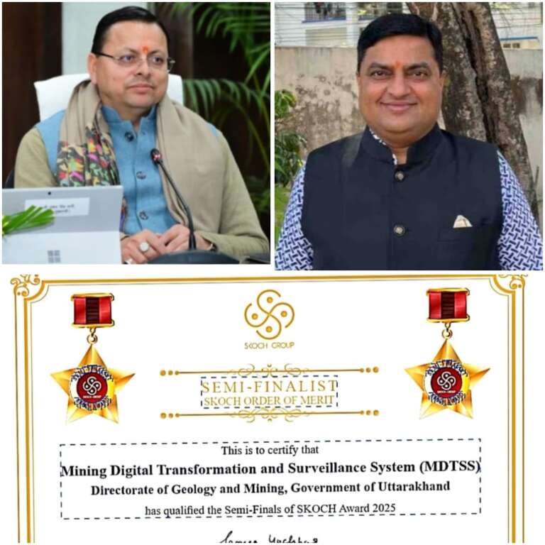 उत्तराखण्ड के भूतत्व एवं खनिकर्म विभाग के लिए गर्व का क्षण है। विभाग के दो महत्वपूर्ण और नवाचारी प्रोजेक्ट – MDTSS (Mining Digital Transformation and Surveillance System) तथा ई-रवन्ना सिक्योरिटी पेपर प्रणाली — का चयन प्रतिष्ठित 106वें SKOCH Group समिट में India’s Honest Independent Honour के लिए किया गया है।