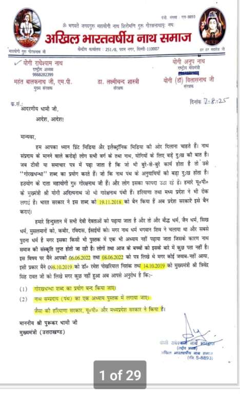अखिल भारतीय नाथ समाज के प्रमुख योगी राधे श्यामनाथ ने बताया कि इस आशय का एक पत्र उत्तराखंड के मुख्यमंत्री पुष्कर सिंह धामी को भी प्रेषित किया गया है।