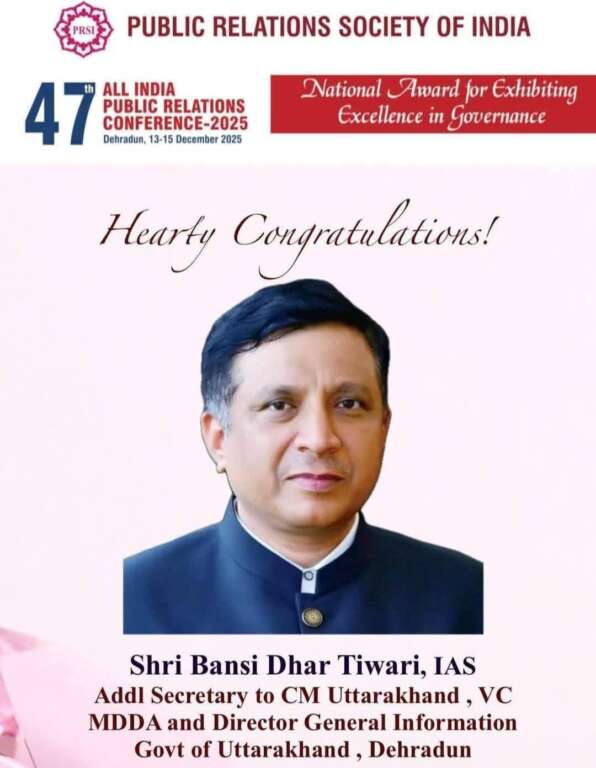 देहरादून: सुशासन उत्कृष्टता के लिए IAS बंशीधर तिवारी को राष्ट्रीय पुरस्कार, पत्रकारों में खुशी की लहर