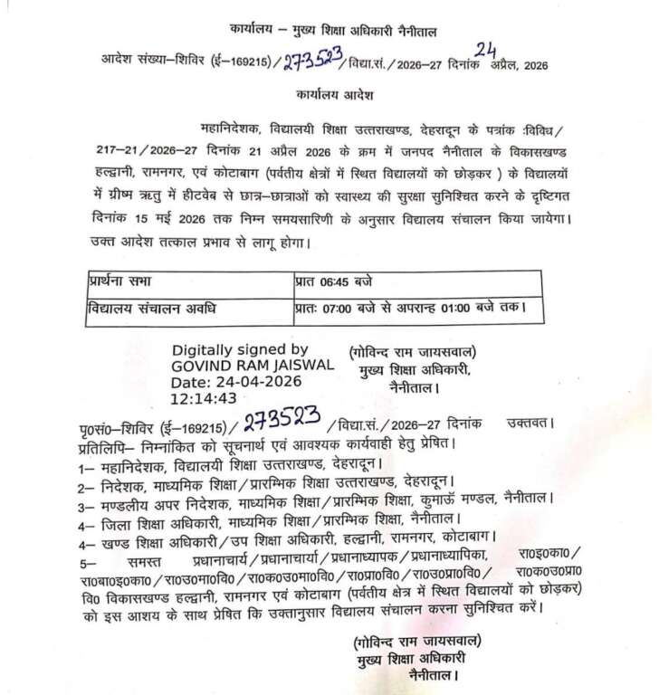 हल्द्वानी: हीट वेव का असर, स्कूलों का बदला समय, सुबह 7 से दोपहर 1 बजे तक चलेगी कक्षाएं, आदेश जारी
