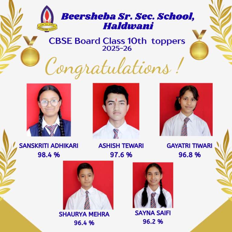 हल्द्वानी 15.04.2026 :10 वी में बियरशिबा सीनियर सेकेण्डरी स्कूल, हल्द्वानी का परीक्षाफल उत्कृष्ट रहा। संस्कृति अधिकारी ने 98.4 प्रतिशत सर्वश्रेष्ठ अंक लाकर विद्यालय का मान बढ़ाया है। आशिष तिवारी ने 97.6, गायत्री तिवारी ने 96.8, शौर्या मेहरा ने 96.4, श्याना सैफी ने 96.2, करन रुवाली ने 95.8, अलायजा ने 95.6, दिव्यांशी मेहरा ने 95.2, स्नेहा कठायत ने 95.2, समन हुड्डा अंसारी ने 95, रिषभ थापा ने 94.6, भीनी शर्मा ने 93, आरुशमान अंसारी ने 92, पियुष ने 92, किशन सिंह ने 91.8, कनिष्का ने 91.2, सृष्टि राना ने 91.2, अक्षित कुमार आर्या ने 90, मीनाक्षी 90 प्रतिशत सर्वश्रेष्ठ अंक लाकर विद्यालय का मान बढाया है।
