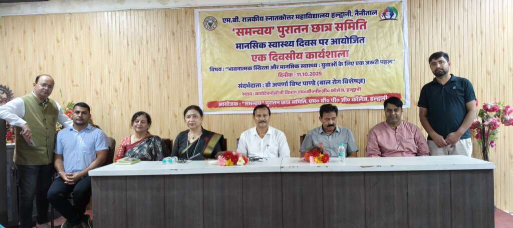 हल्द्वानी, 10 अक्टूबर 2025 — *एम बी पी जी कॉलेज की *समन्वय पुरातन छात्र समिति* द्वारा “भावनात्मक स्थिरता और मानसिक स्वास्थ्य: युवाओं के लिए एक जरूरी पहल” विषय पर एक दिवसीय कार्यशाला का आयोजन एम.बी. पी.जी. कॉलेज, हल्द्वानी के बायोटेक्नोलॉजी विभाग में किया गया।