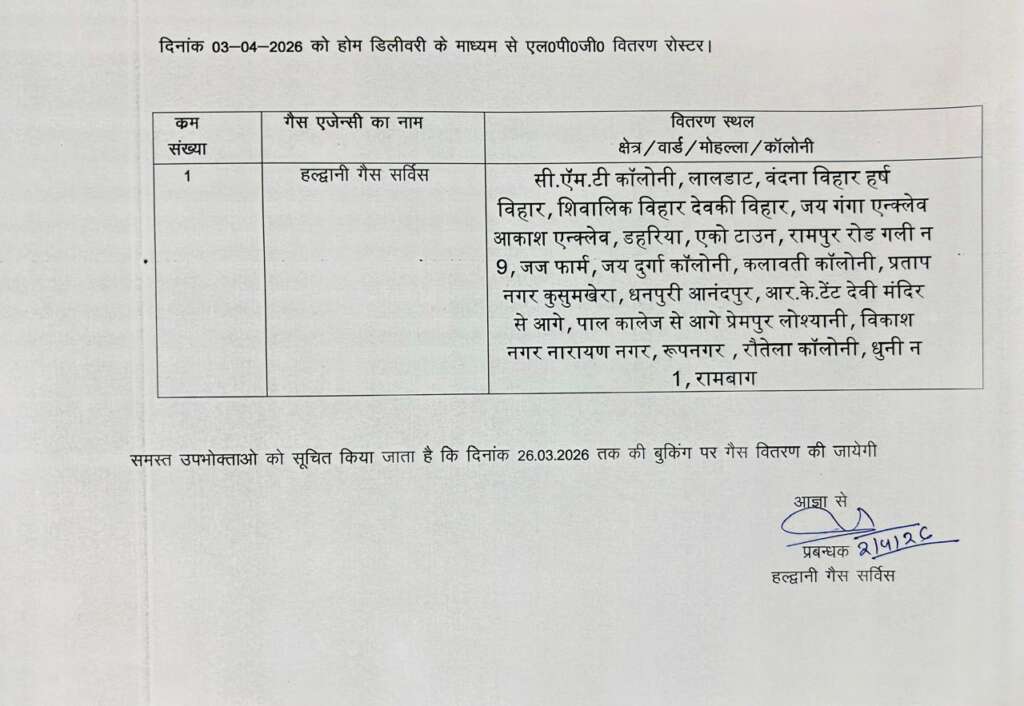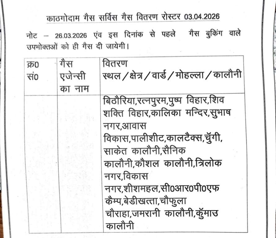 हल्द्वानी में गैस की आपूर्ति ठीक तरह से करने को लेकर प्रशासन ने अब अलग-अलग जगहों के हिसाब इंडियन गैस बांटनी शुरू कर दी है, जिसमें हल्द्वानी गैस सर्विस और काठगोदाम गैस सर्विस के साथ ही क्षितिज गैस सर्विस द्वारा नीचे दिये गये स्थानों पर गैस सिलेंडर बांटे जायेंगे। देखिए अपने क्षेत्र का नाम…