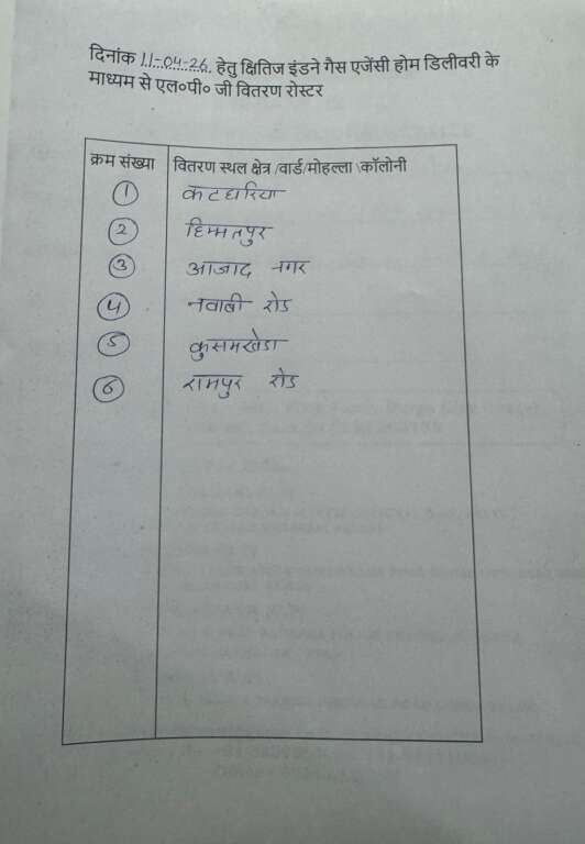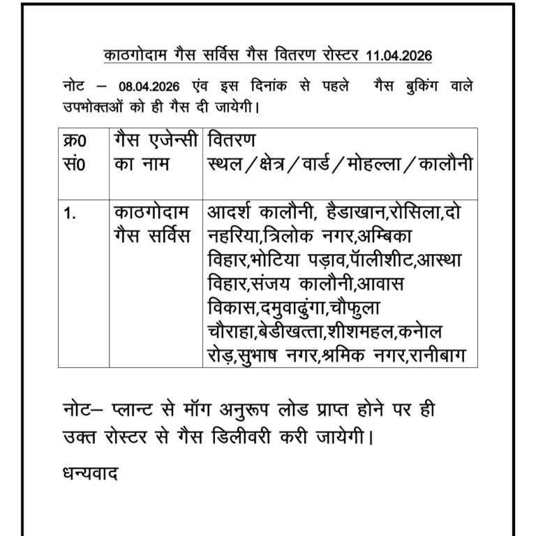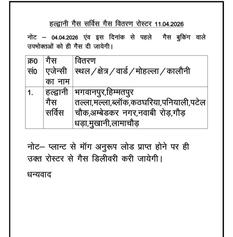 हल्द्वानी में प्रशासन के निर्देश के बाद सभी इंडियन गैस सर्विस द्वारा रोस्टर जारी किया जा रहा है,ताकि लोगों को आसानी से इंडियन गैस की आपूर्ति हो सके, काठगोदाम इंडियन गैस सर्विस, हल्द्वानी इंडियन गैस सर्विस, क्षितिज गैस सर्विस द्वारा कल इन जगहों पर इंडियन गैस की सिलेंडरों की आपूर्ति की जएगी।
