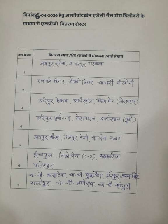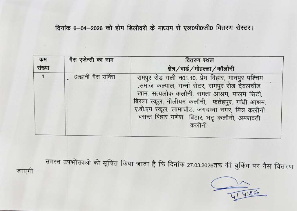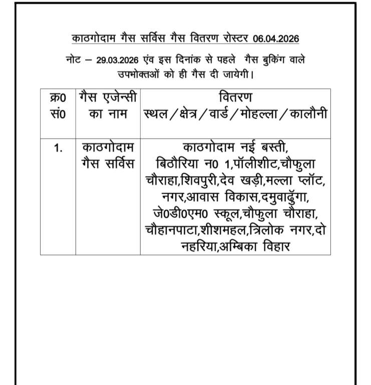 कुमाऊं मंडल विकास निगम की काठगोदाम एवं हल्द्वानी इंडने गैस ऐजेंसी एवं आश्रीबाद इंडने गैस ऐजेंसी का दिनाक 6 अप्रैल का रोस्टर तथा क्षितिज इंडने द्वारा 5 अप्रैल के रोस्टर जारी किया गया है।
