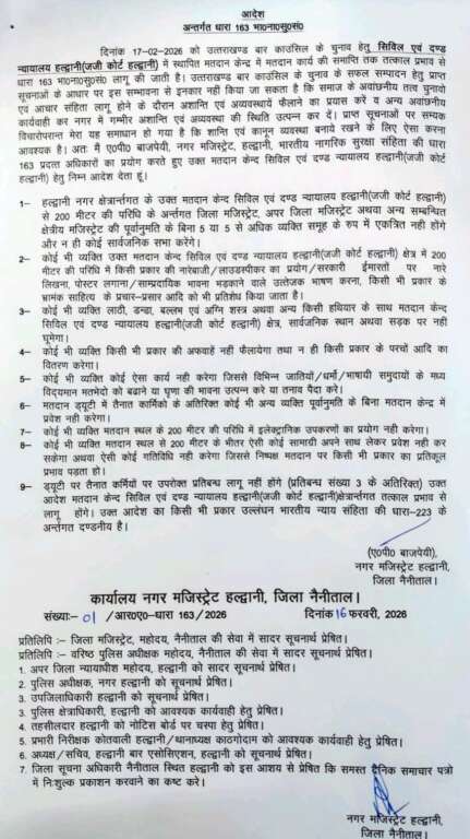 हल्द्वानी: बार काउंसिल चुनाव को लेकर जजी कोर्ट परिसर में धारा 163 लागू, सिटी मजिस्ट्रेट एपी बाजपेयी ने जारी किया आदेश