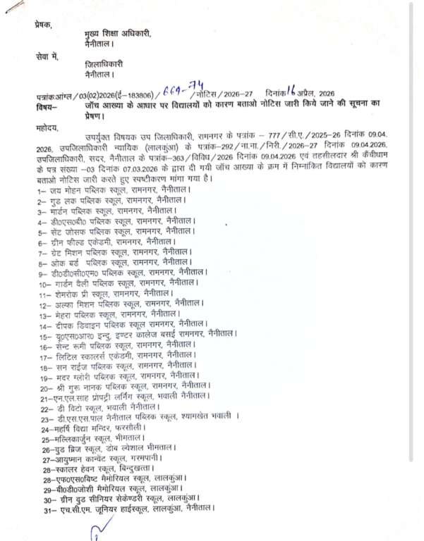 नैनीताल। जिले में शिक्षा व्यवस्था को लेकर प्रशासन ने सख्त रुख अपनाया है। मुख्य शिक्षा अधिकारी, नैनीताल द्वारा विभिन्न उपजिलाधिकारियों और तहसीलदार की जांच रिपोर्ट के आधार पर 34 विद्यालयों को कारण बताओ नोटिस जारी किया गया है।