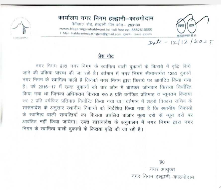 नगर आयुक्त परितोष वर्मा ने बताया कि शहरी विकास सचिव द्वारा जारी शासनादेश के अनुसार स्थानीय निकायों को निर्देशित किया गया है कि उनकी स्वामित्व वाली संपत्तियों का किराया बाजार मूल्य से कम दरों पर आवंटित नहीं किया जाएगा। इसी आदेश के अनुपालन में नगर निगम हल्द्वानी ने दुकानों के किराये में संशोधन (वृद्धि) की प्रक्रिया शुरू कर दी है।